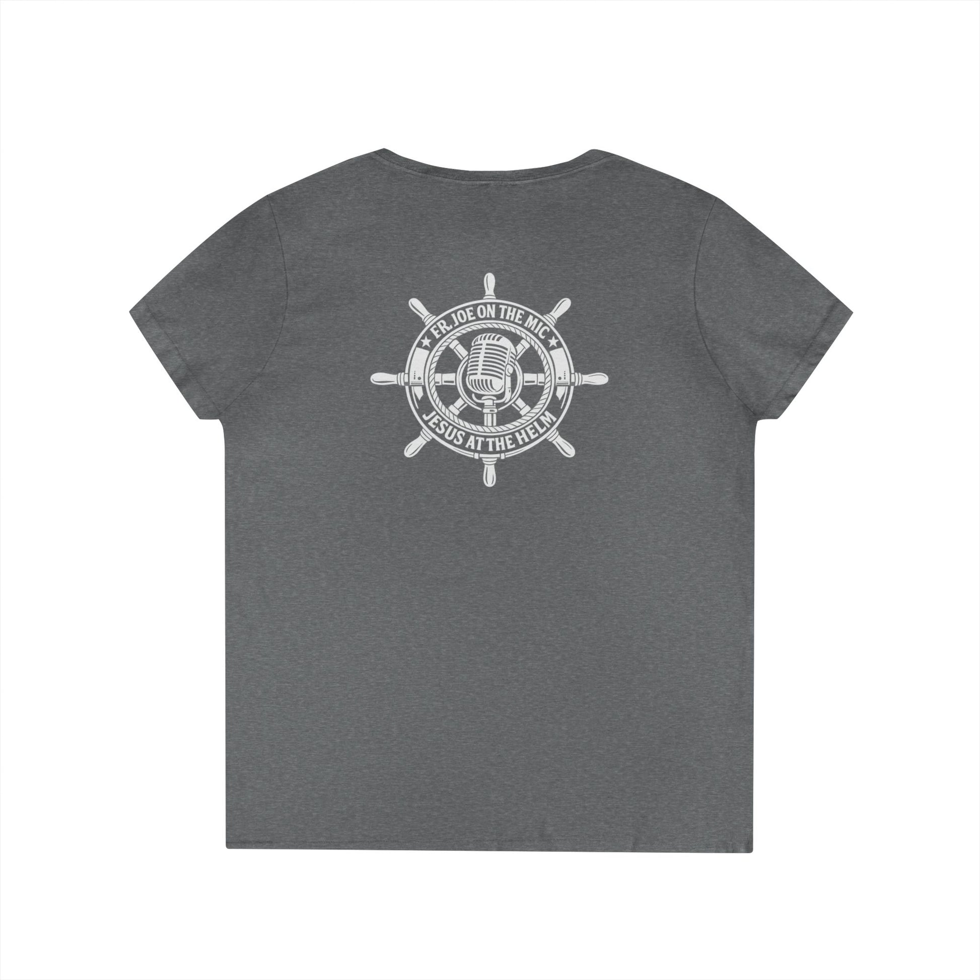 Going on the Good News Cruise? You need a Cruise Crew shirt with Fr. Joe on the Mic and Jesus at the helm! Soft, and quietly confident — this V-neck tee slips easily into days when comfort and subtle expression matter. The front carries a small, vintage-style badge logo that reads “Joe in Black Ministries,” while the back reveals a faded helm-and-microphone motif that feels like a well-traveled emblem. Wear it to coffee after Sunday service, to casual meet-ups with your community group, or on evenings when you want something that reads humble and thoughtful.